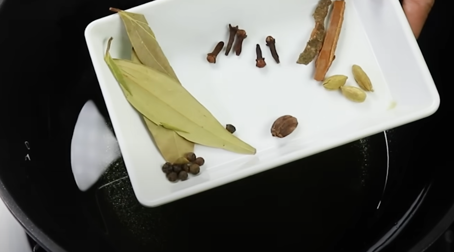 ایک پین میں گھی یا تیل ڈال کر اس میں لونگ،کالی مرچ،کڑی پتہ،چھوٹی الاچی اور بڑی الاچی ڈال کر بھون لیں